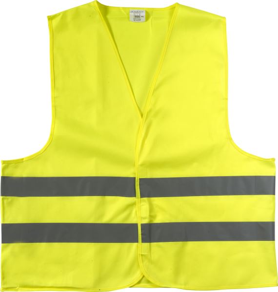 100% Polyester neon high visibility safety jacket (150D). (LxW) M= 66x60cm, XL= 73x67cm, XXL= 75x72cm .