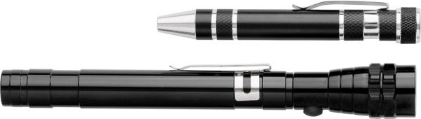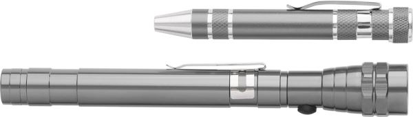 Set of aluminium telescopic torch with three LED lights and a pen shaped screwdriver with four flat headed and four Phillips screwdriver bits. Presented in a black gift box.